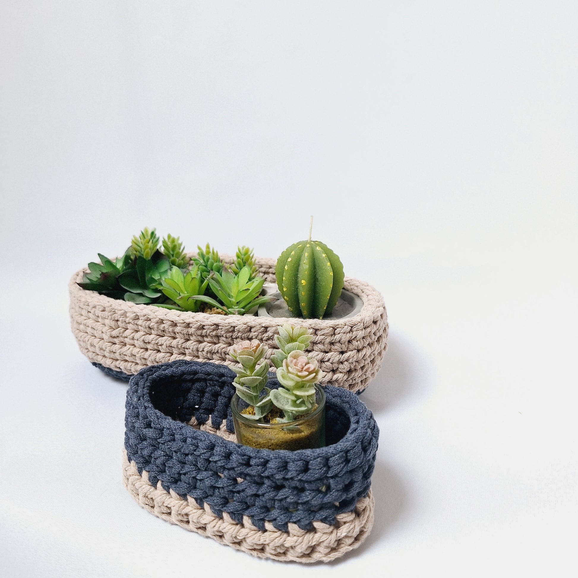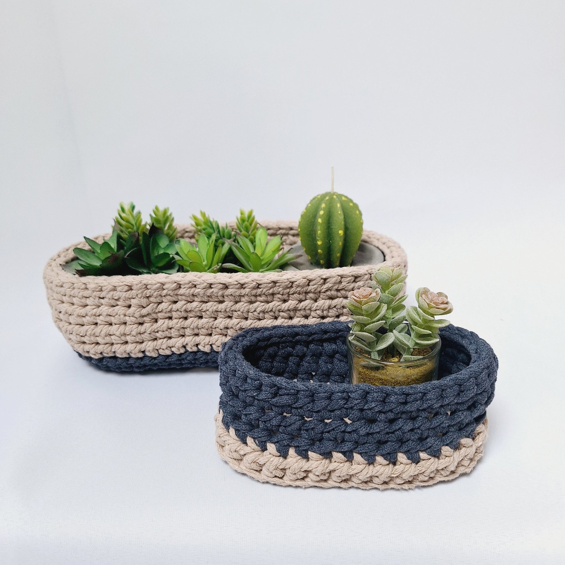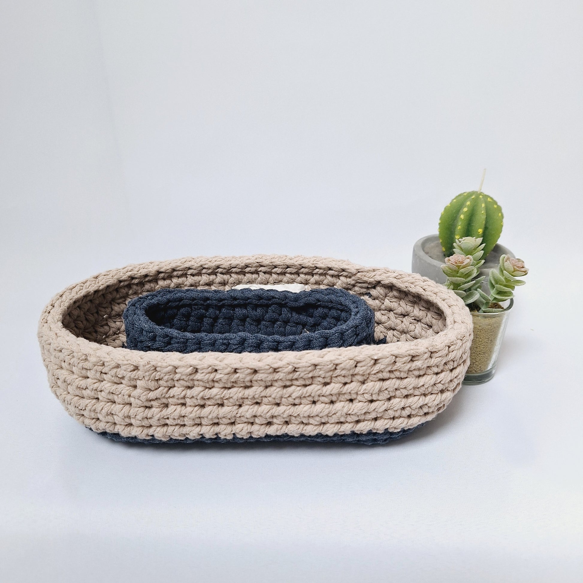 Set de deux panières ovales crochetées multi-usages, bicolores gris pétrole /taupe clair
