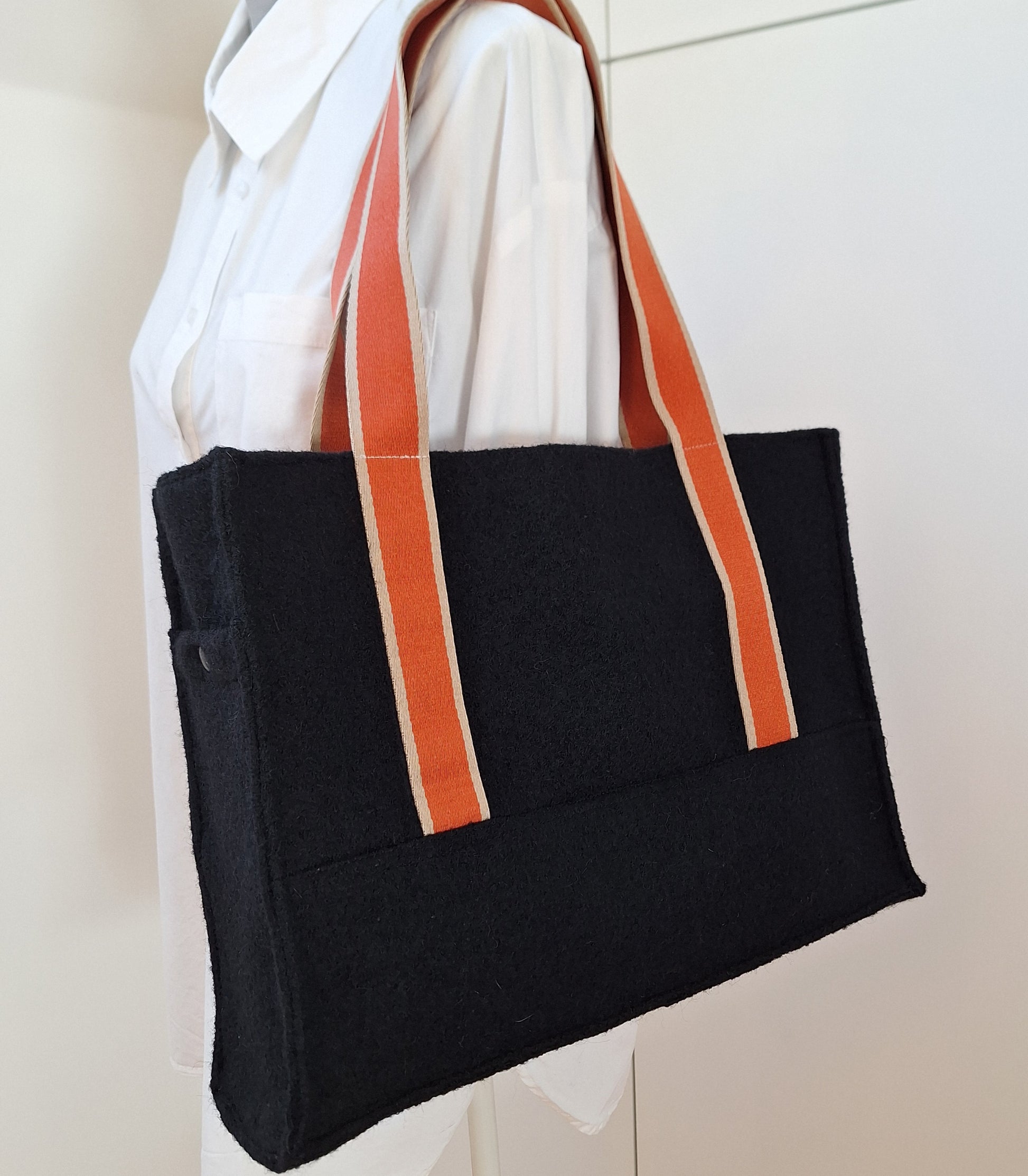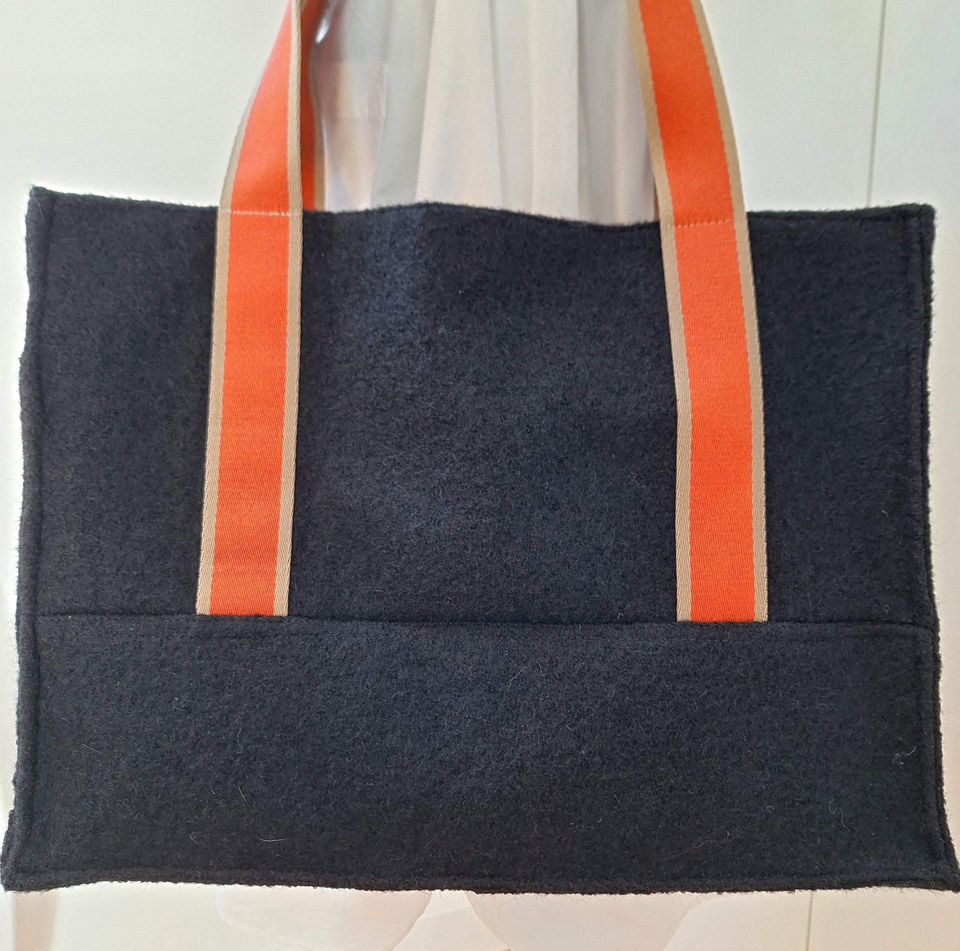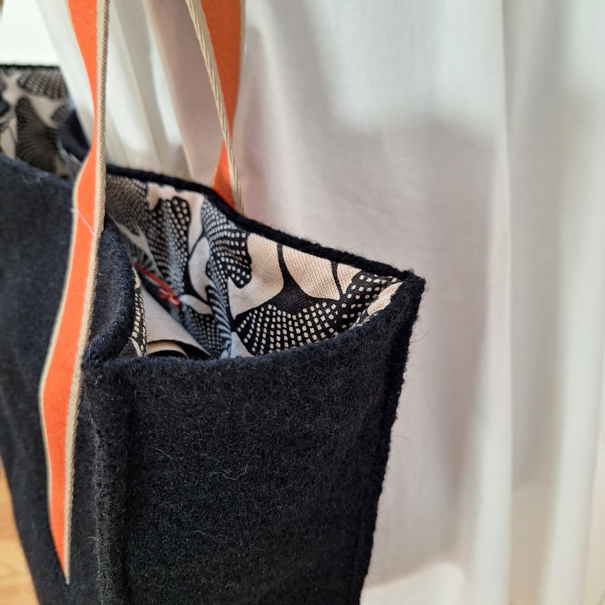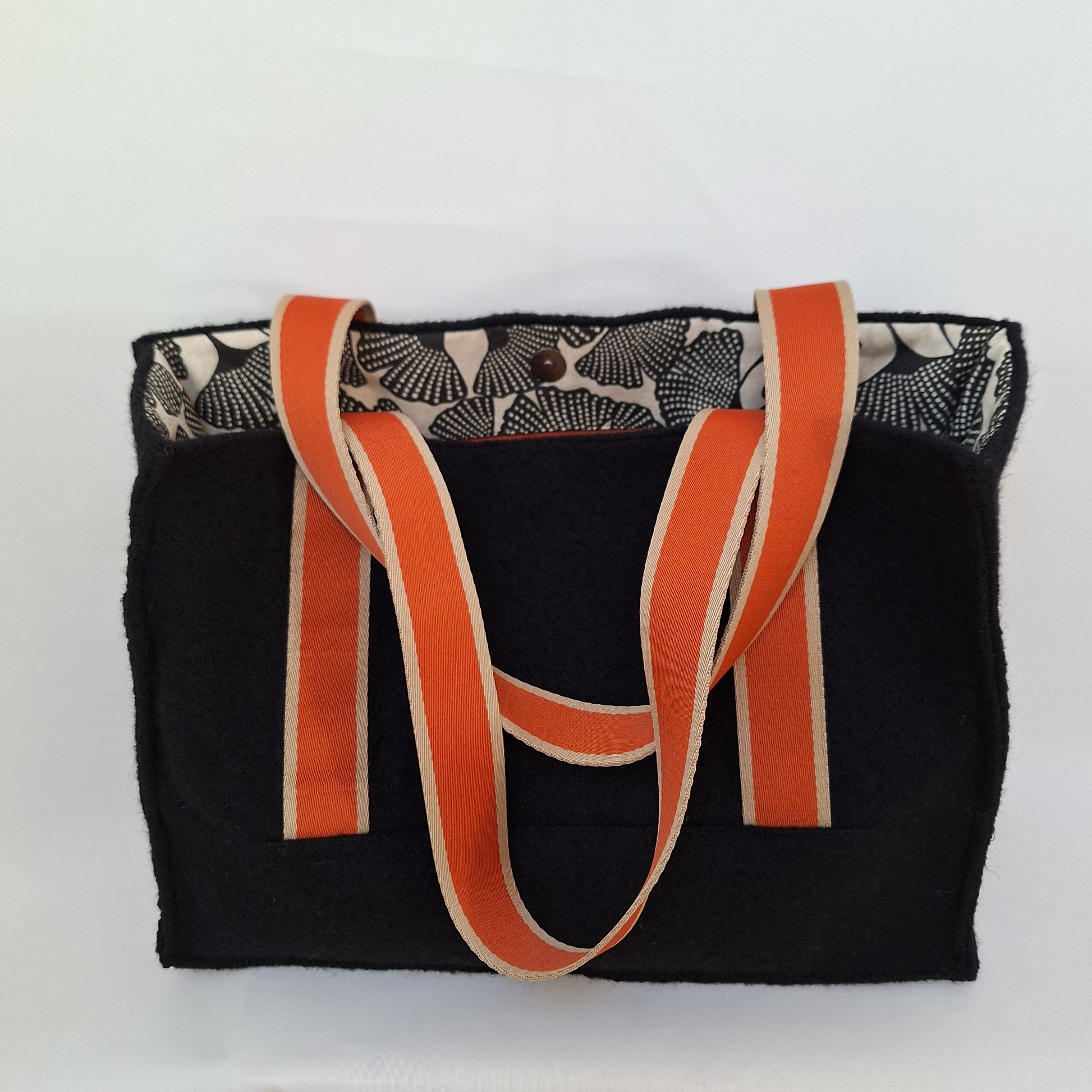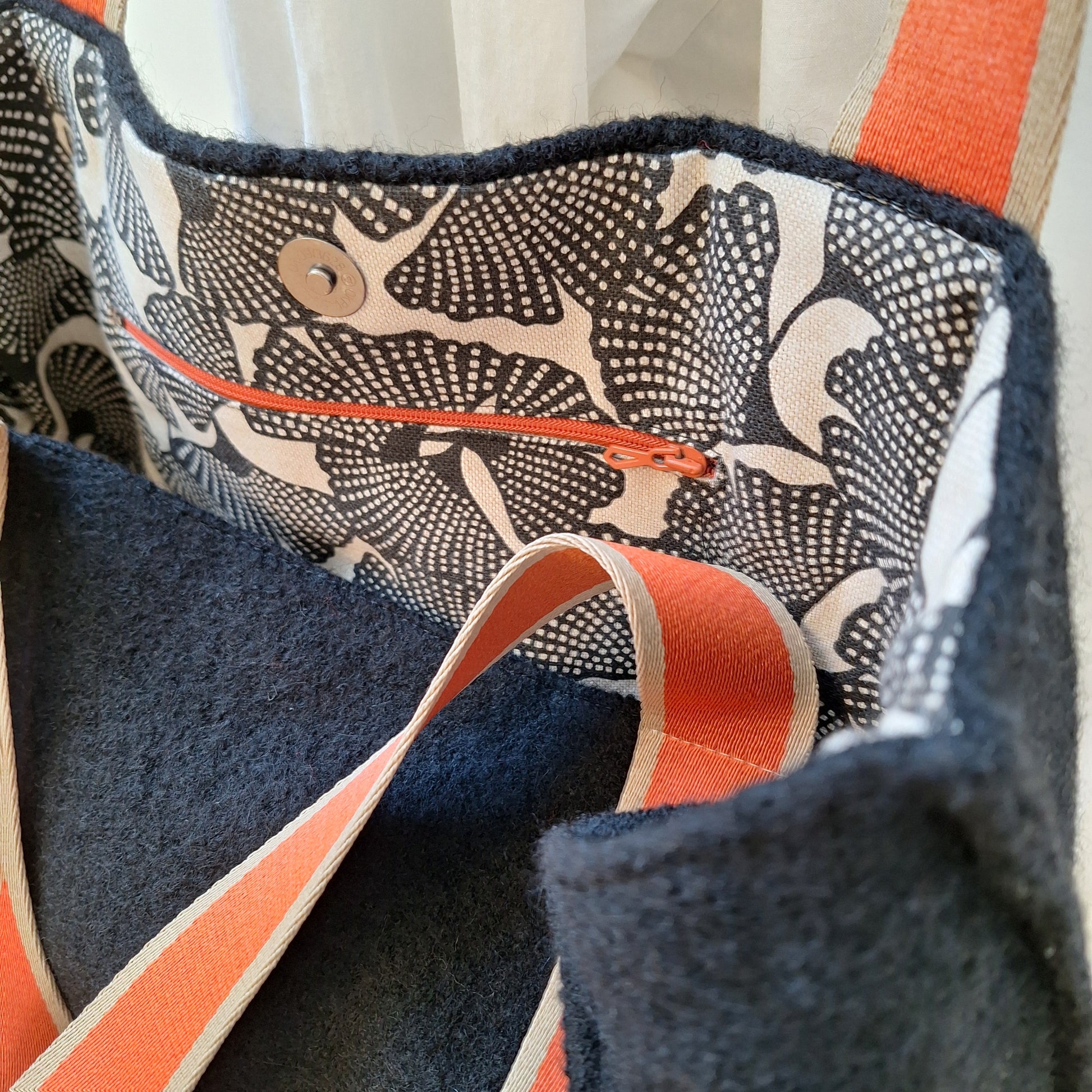 Deux anses permettant un confortable porté épaule. Une poche zippée et deux poches plaquées intérieures . Une poche plaquée latérale extérieure fermée par un bouton pression .