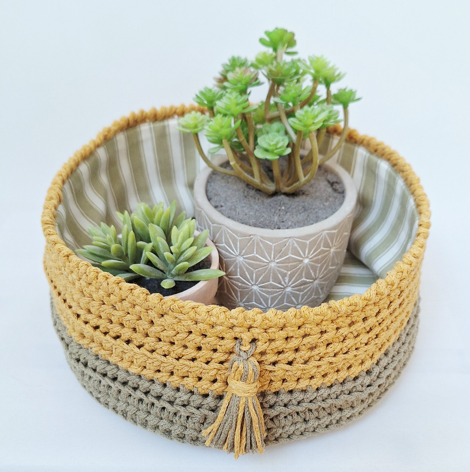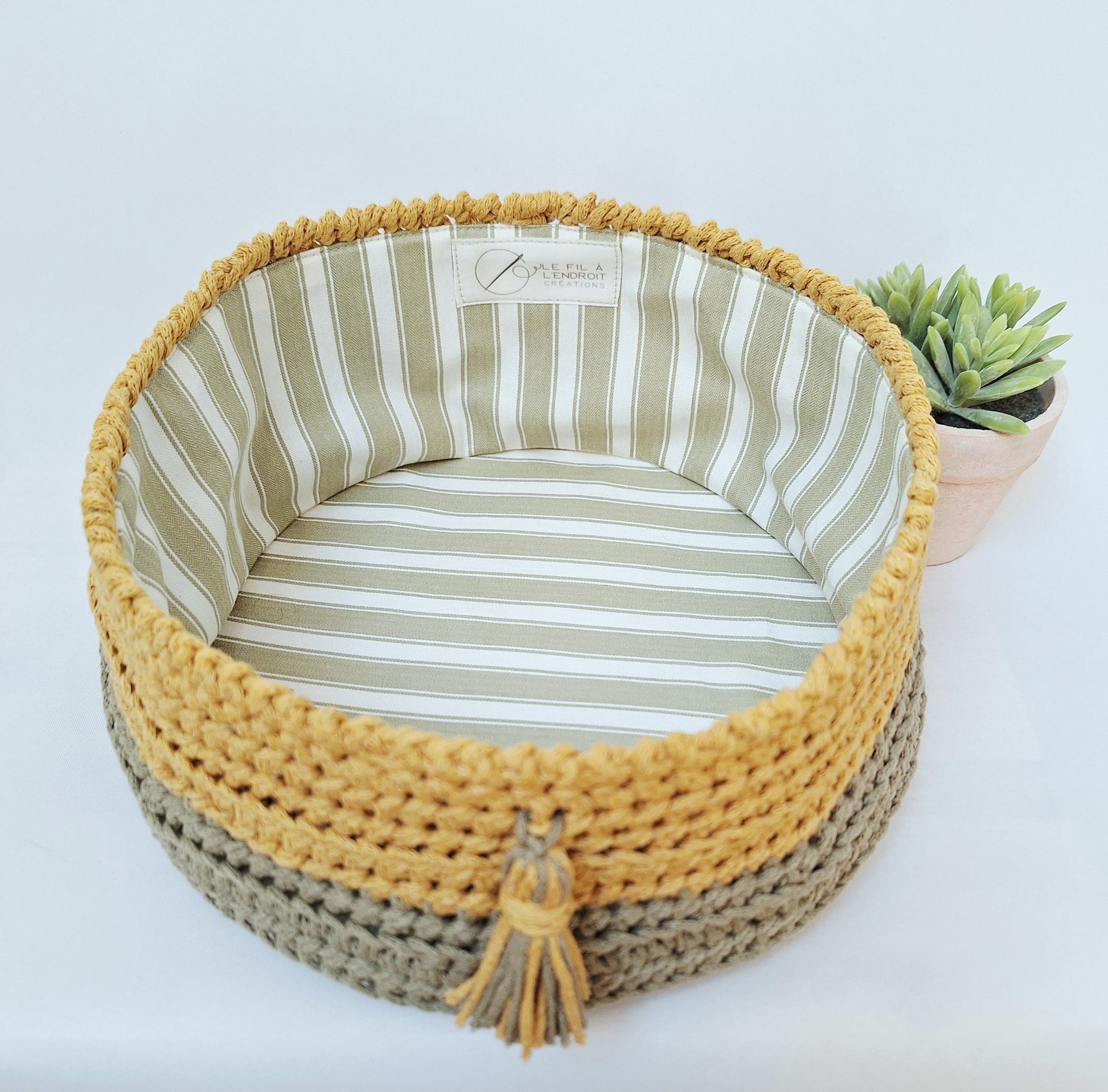 Grande panière ronde crochetée kaki clair/moutarde . Doublée tissu rayé. Un pompon d'ornement.