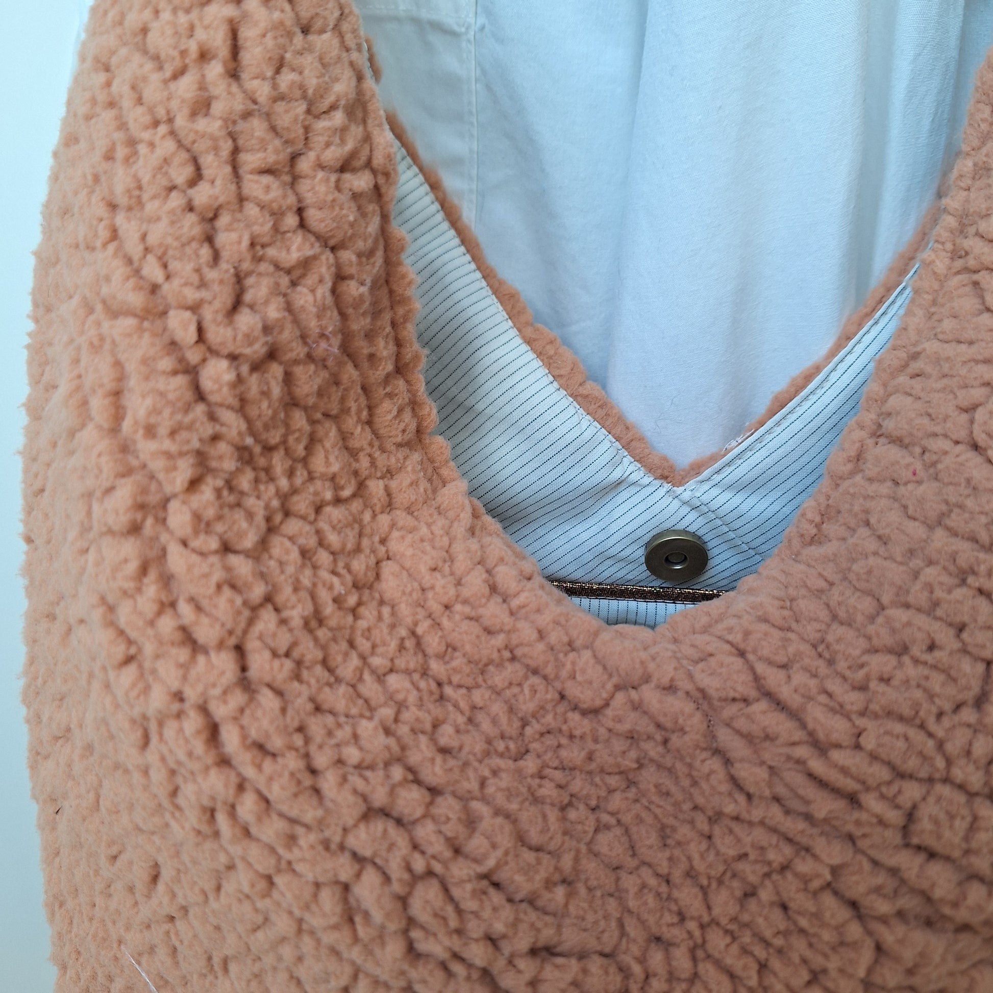 Tissu polyester imitation peau de mouton beige orangé, doublure en coton/polyester fines rayures fond blanc cassé.