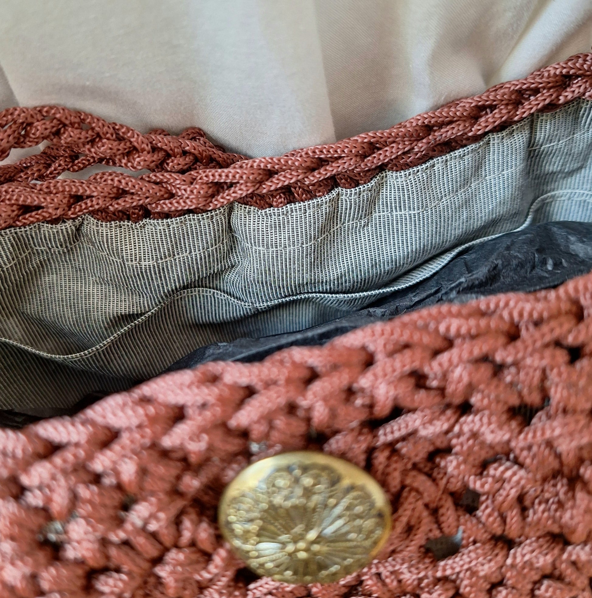 Sac en fil imperméable fauve crocheté au point pop-corn, doublé. Base rectangulaire. Fermeture extérieure par un bouton . 3 poches plaquées intérieures