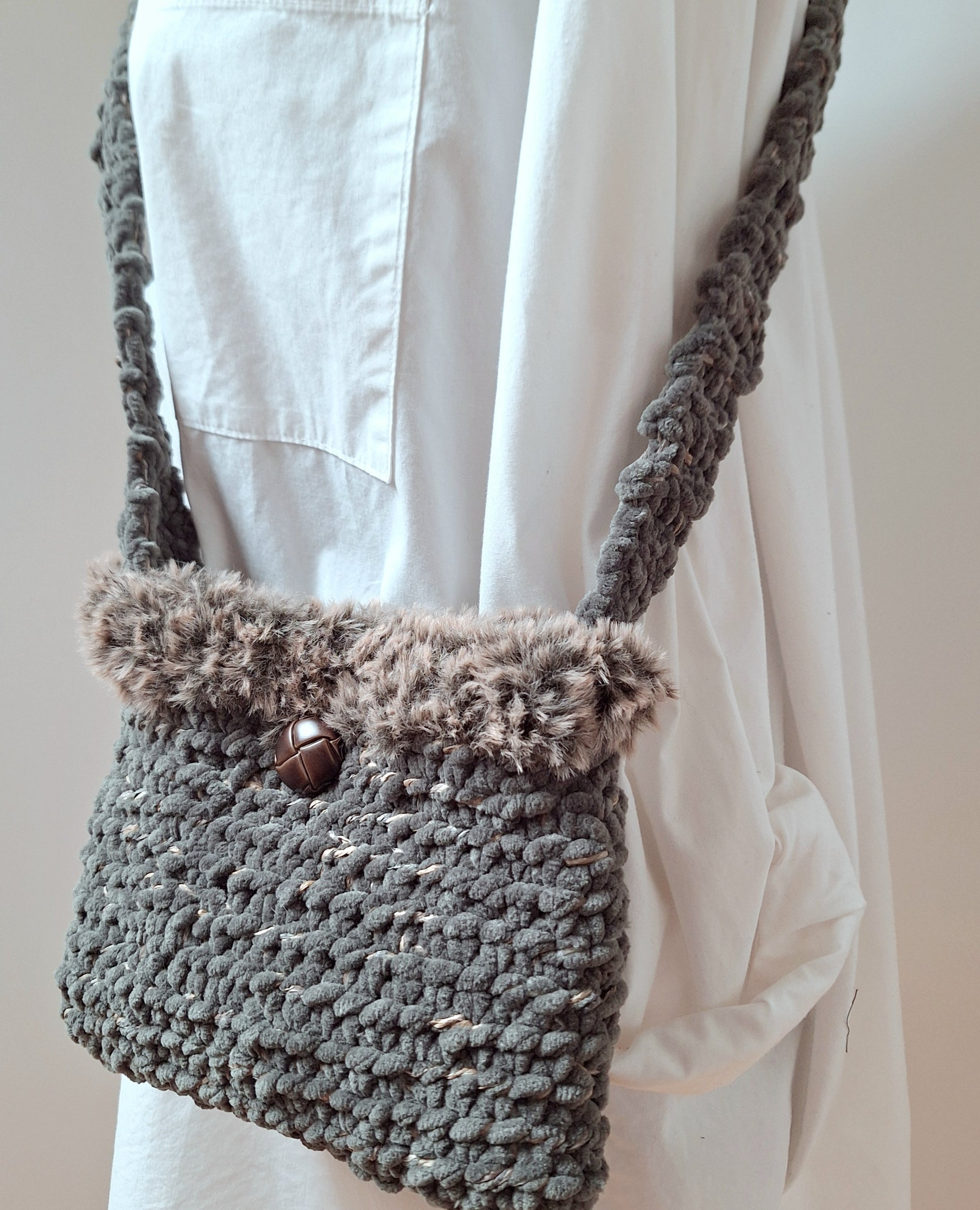 Très doux et léger, SADIE est un petit sac crocheté, parfait pour y glisser ses indispensables. Son fil chenille moelleux vert bronze sera assorti à vos tenues d'automne/hiver.La bordure en fausse fourrure accentue le coté moelleux et hivernal. Fermeture par un bouton pression aimanté doré . Sa large anse permet un porté bandoulière croisée très confortable.