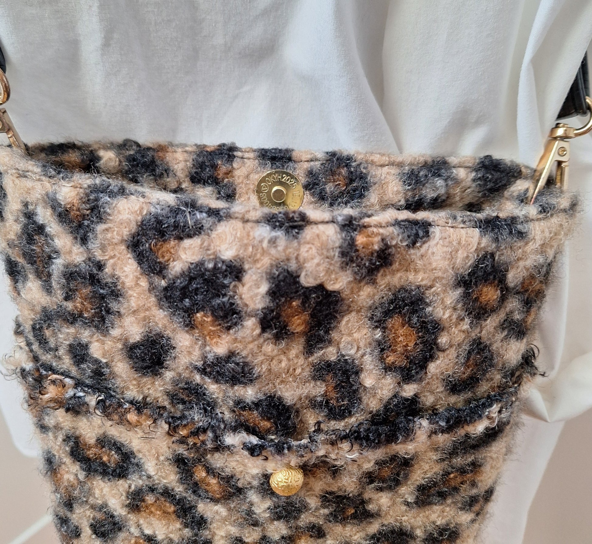 Tissu polyester imitation laine bouclée motif léopard marron/beige/noir côtelé , doublure en tissu coton Oeko-tex blanc cassé . Anse réglable et amovible en simili cuir noir recyclée.