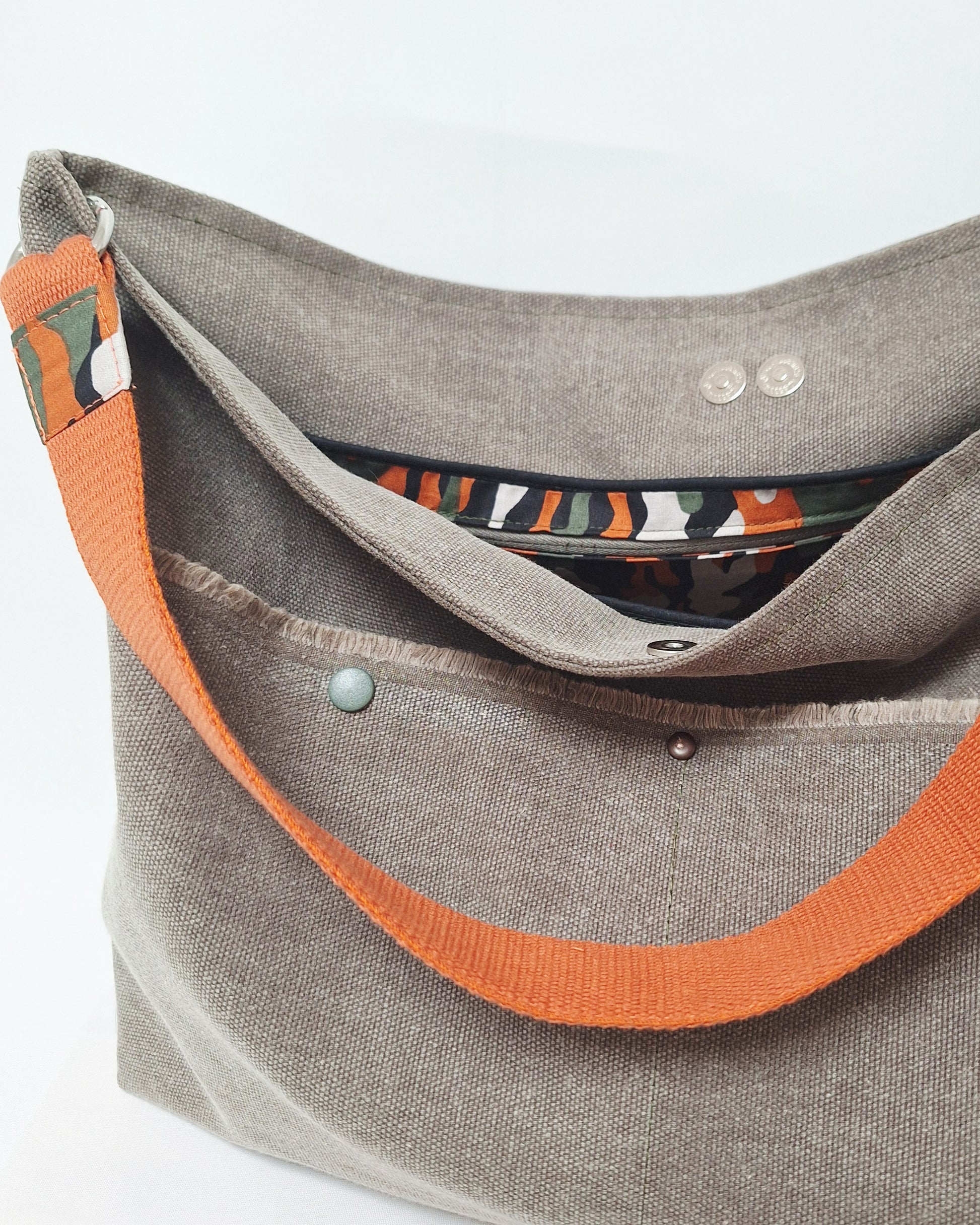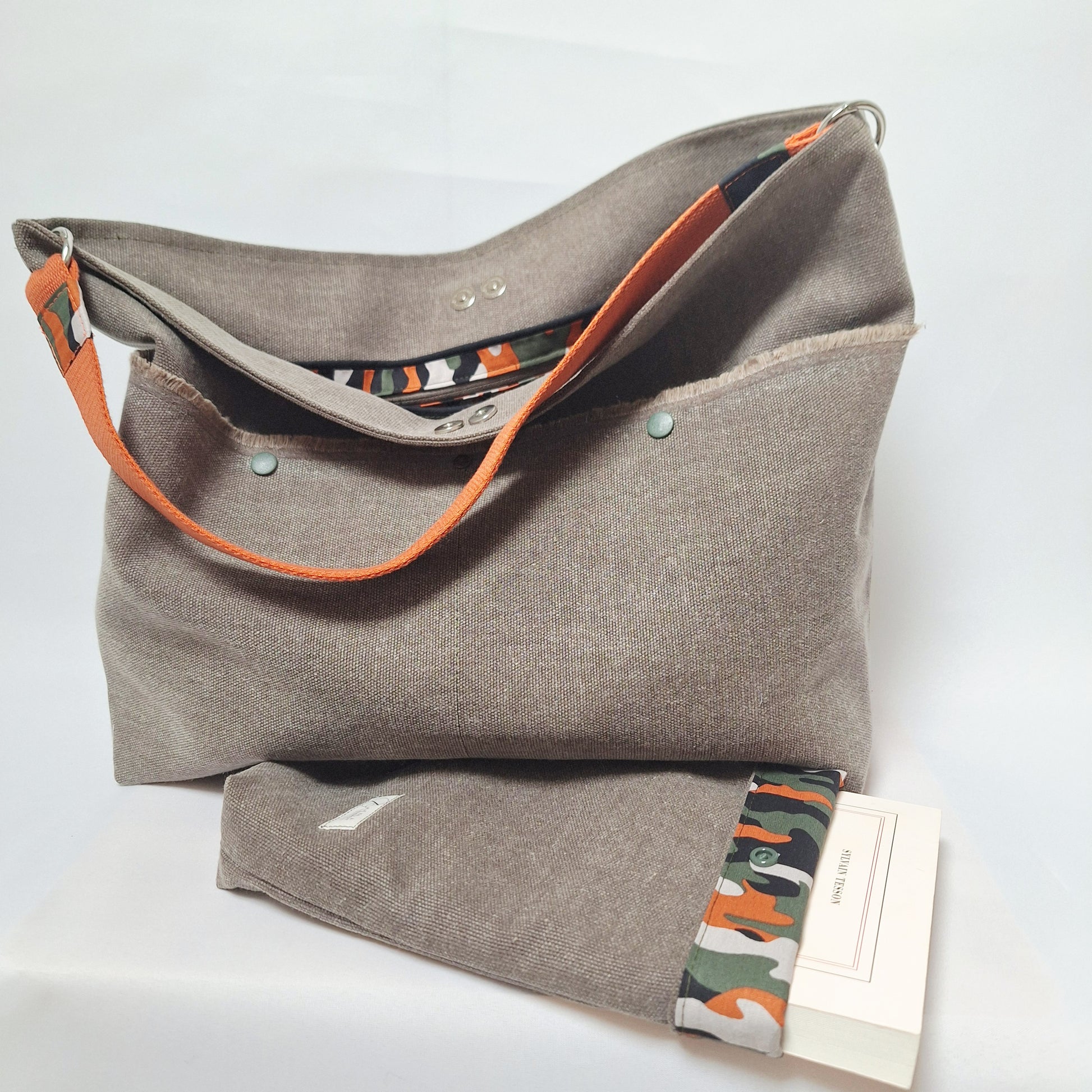 Corps : toile canvas taupe, doublure en coton motif camouflage taupe/orange/kaki. Zip recyclé.