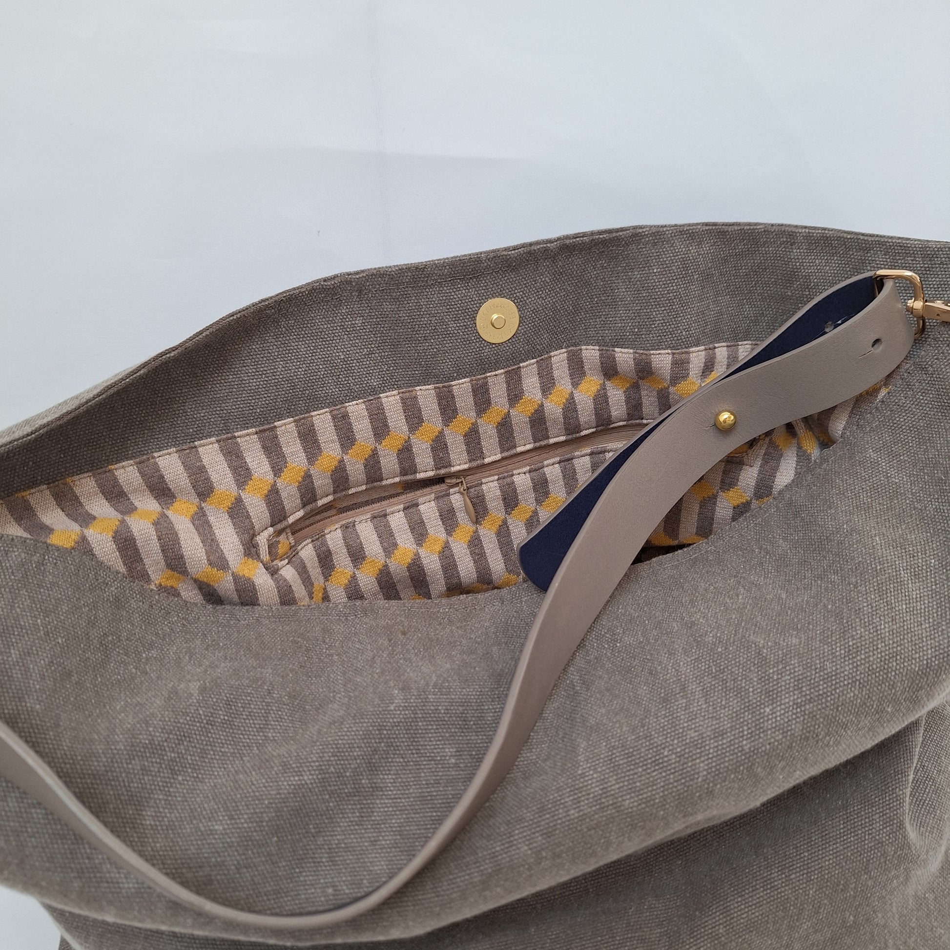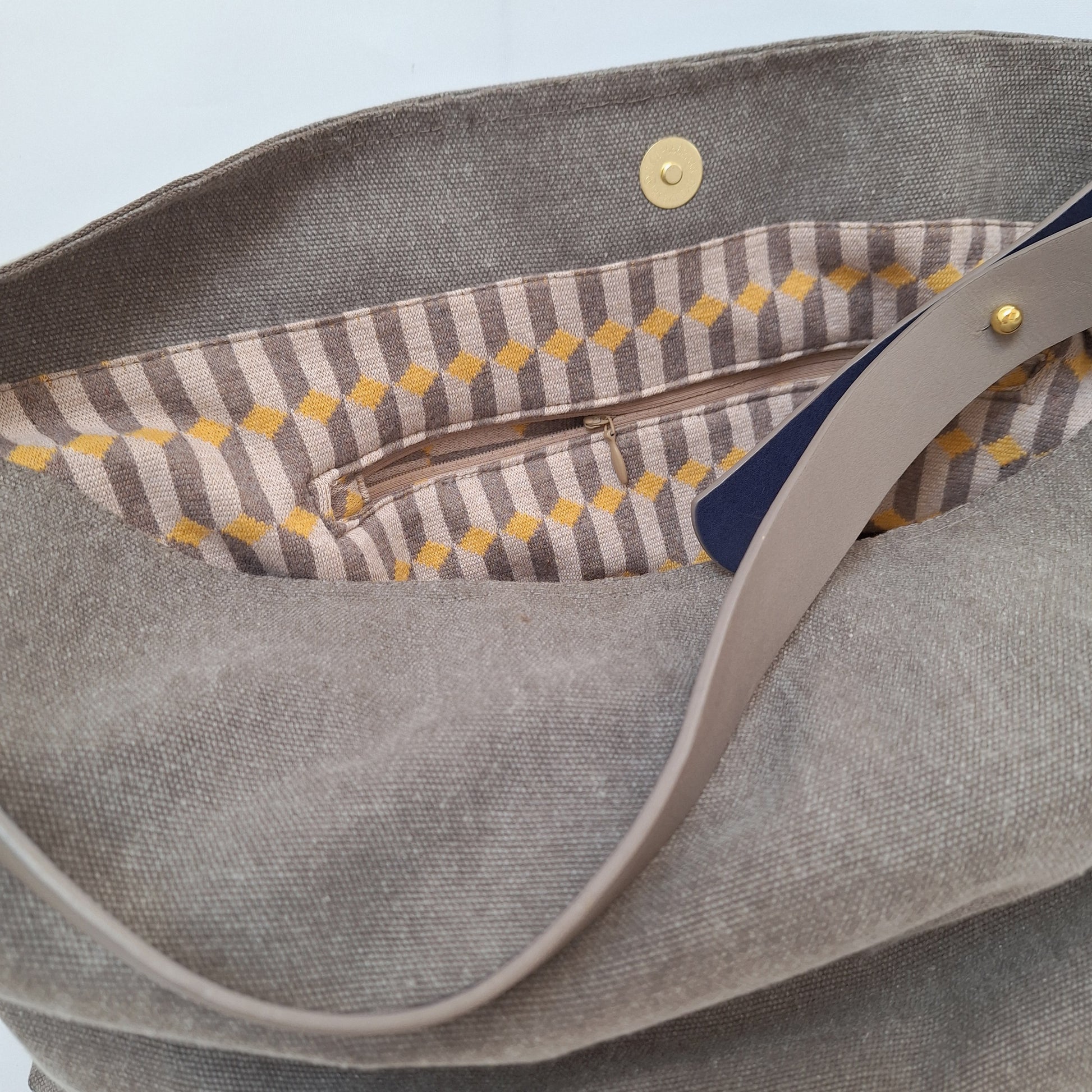 Corps : toile canvas taupe, doublure en jersey à motifs taupe/moutarde/beige. Zip recyclé.