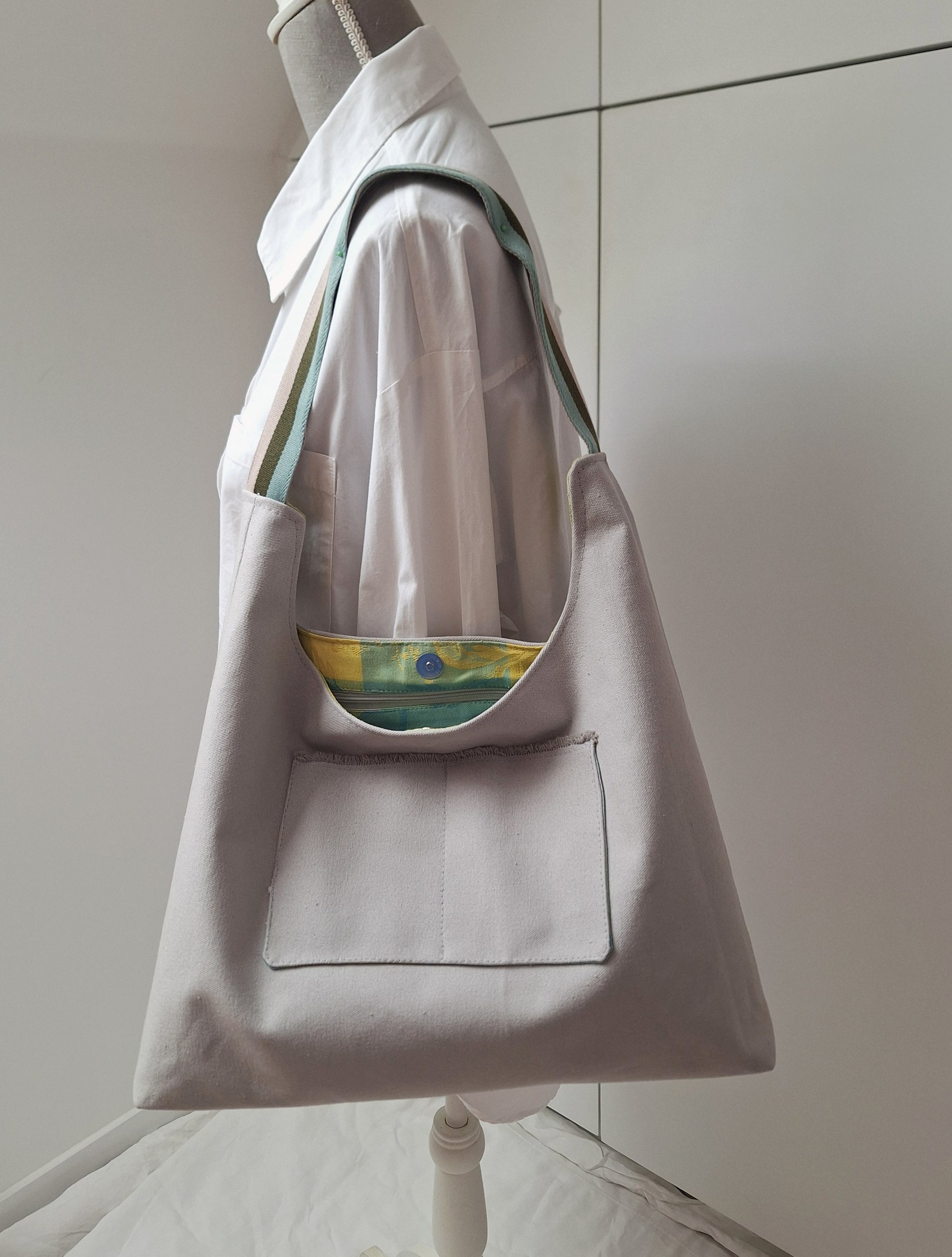 Corps : tissu bachette en coton mélangé gris perle, doublure multicolore recyclée en coton