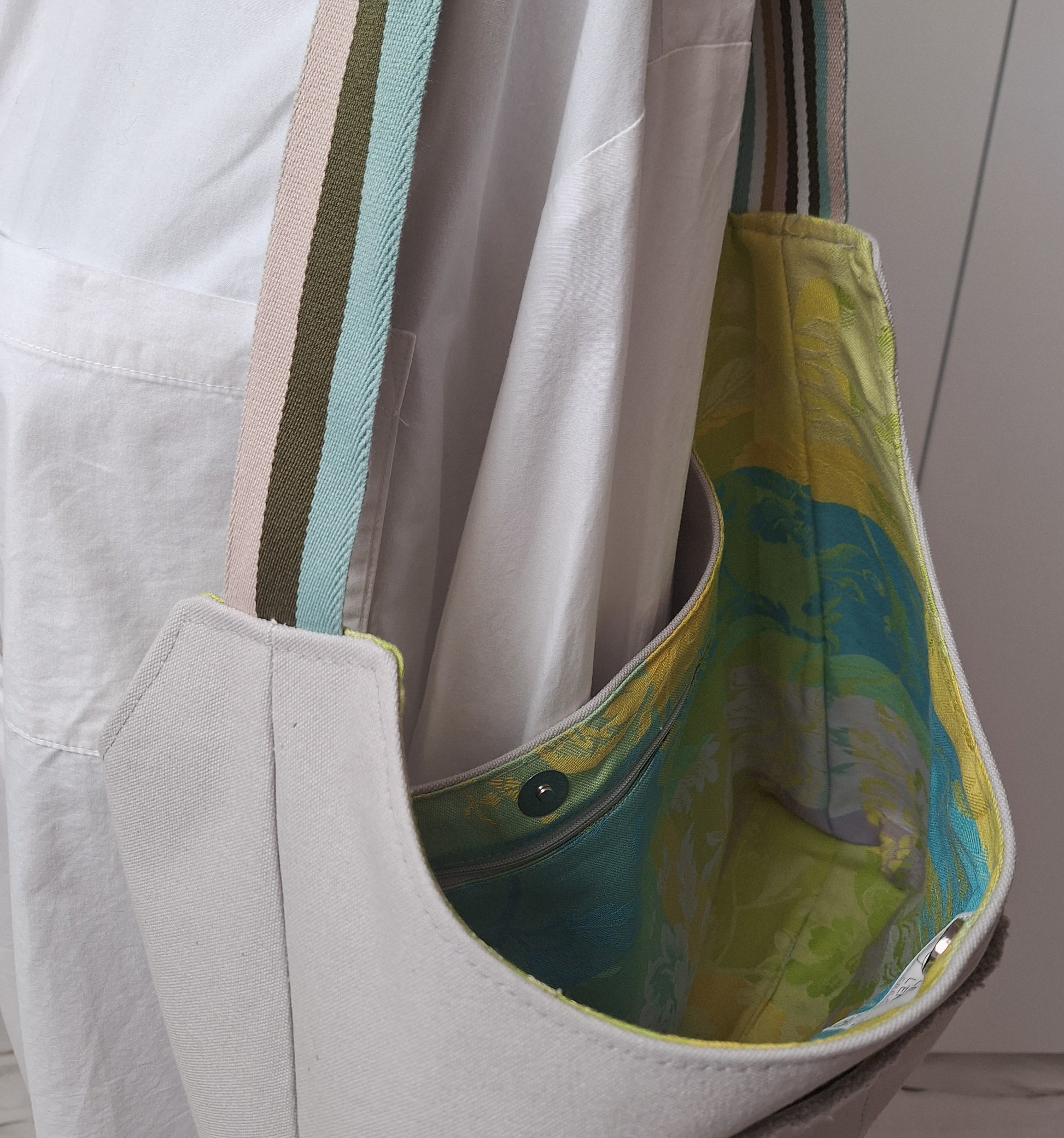 Cabas doublé en tissu,idéal pour la demi-saison, de contenance adéquate pour ranger ses affaires d'une journée. Porté épaule . Fermeture par bouton pression aimanté. Une grande poche intérieure zippée. Une double poche extérieure plaquée.