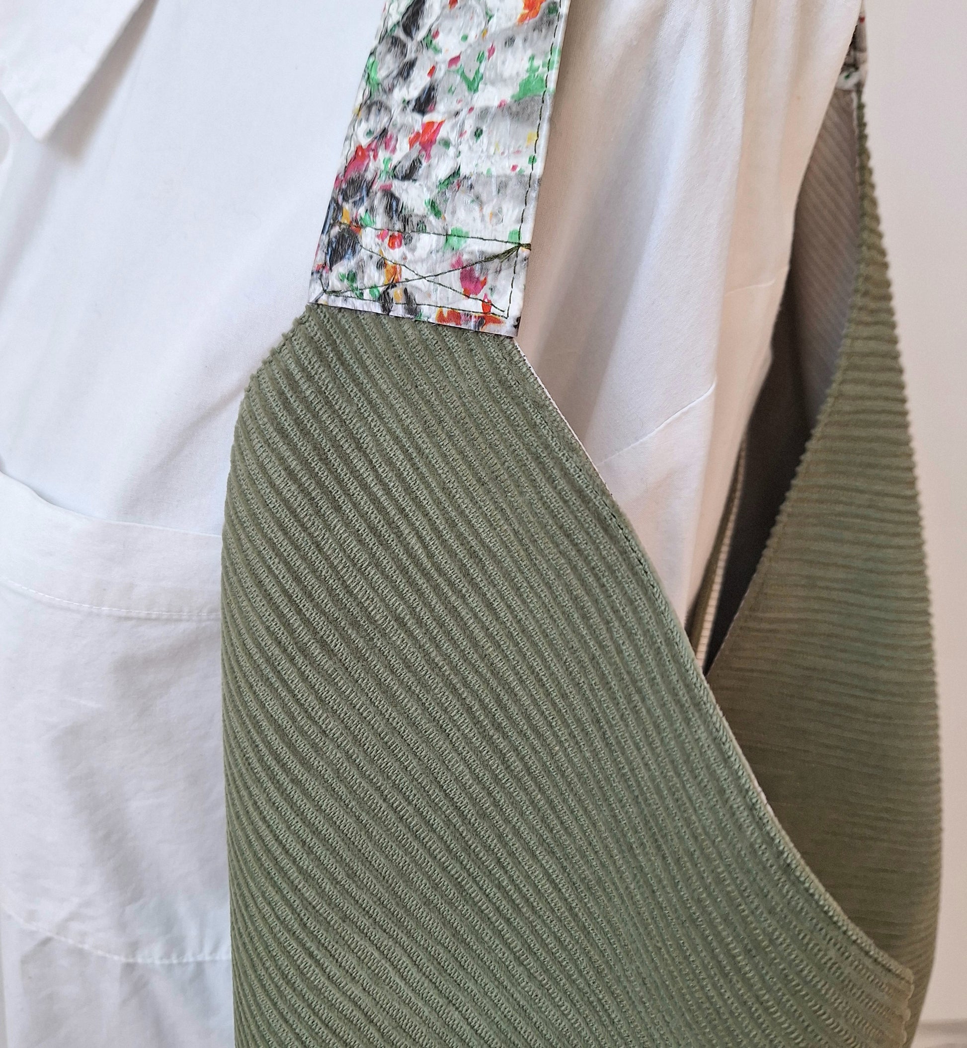 Tissu velours côtelé vert amande, doublure en coton/polyester fines rayures fond blanc cassé.