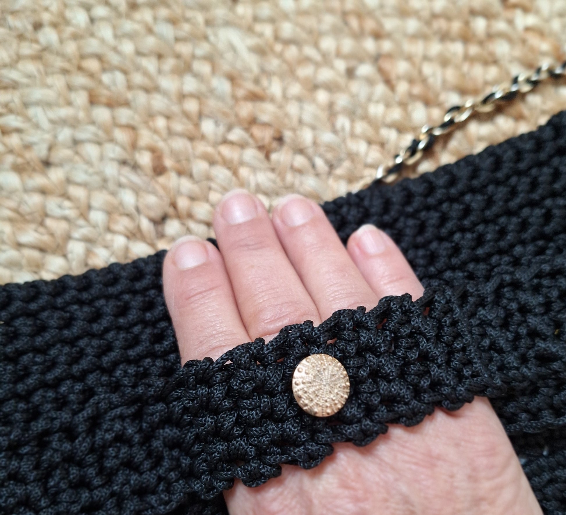 Le deux en un : ce petit sac ou pochette main vous permettra de transporter vos essentiels. Il est crocheté avec un fil imperméable. Se porte à la main ou à l'épaule grâce à sa chainette amovible.