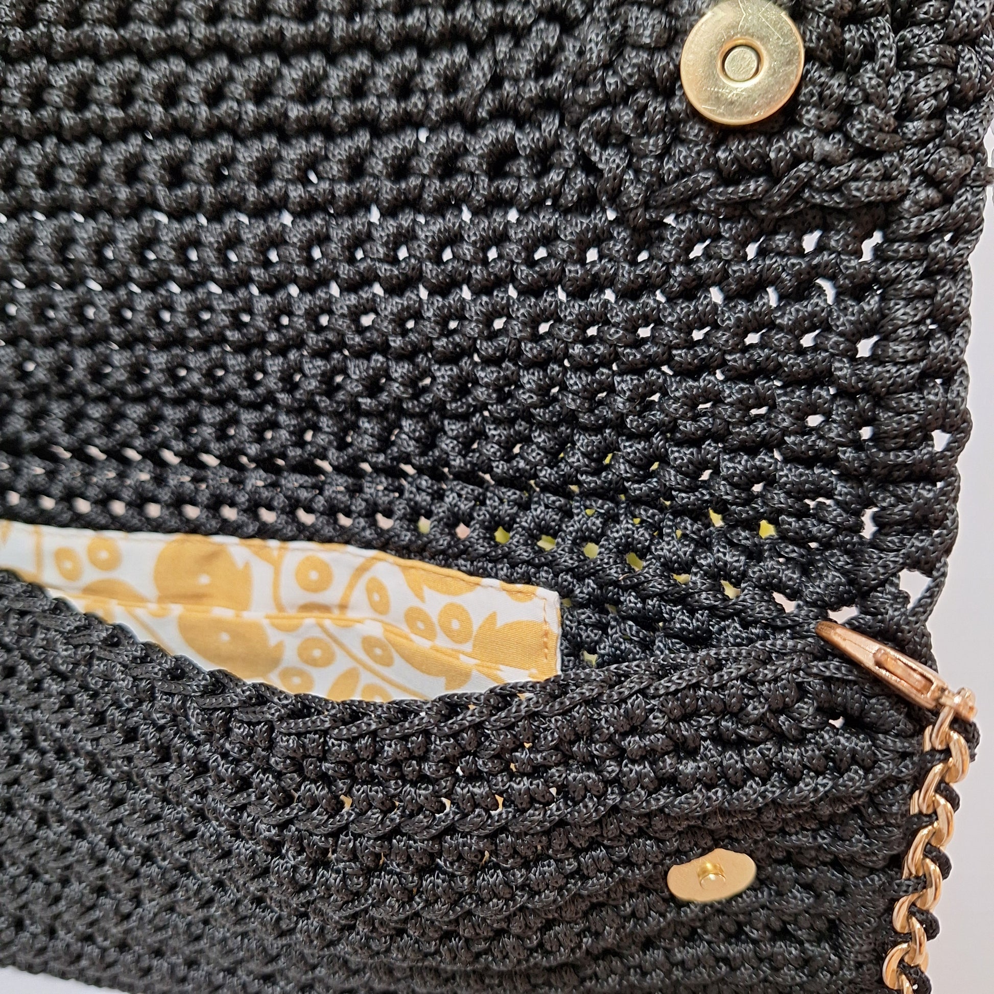 Une poche intérieure en tissu à motifs moutarde/blanc cassé . Fermeture par deux boutons aimantés en métal doré